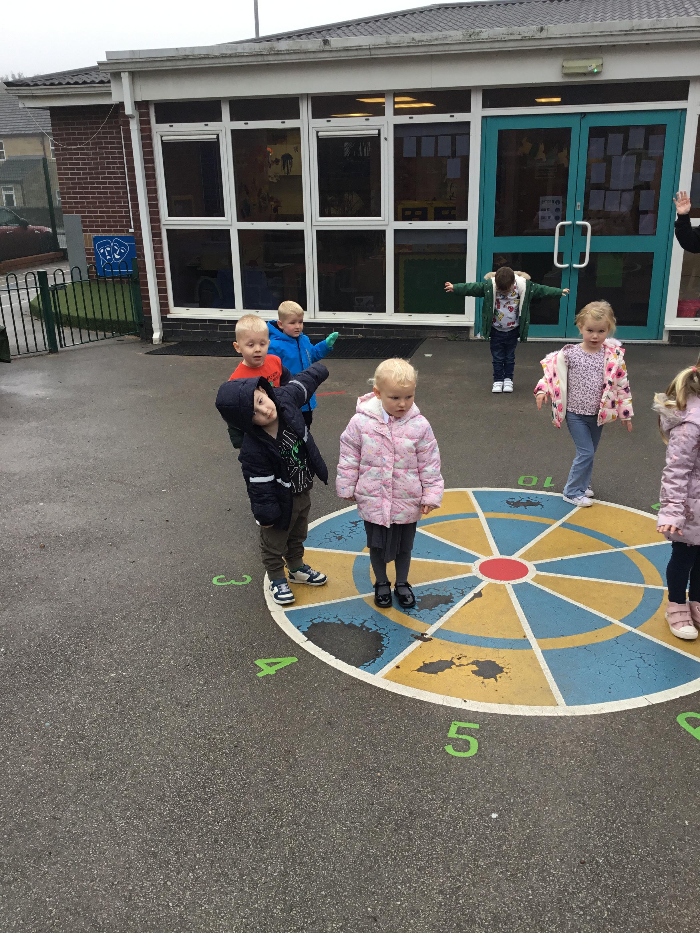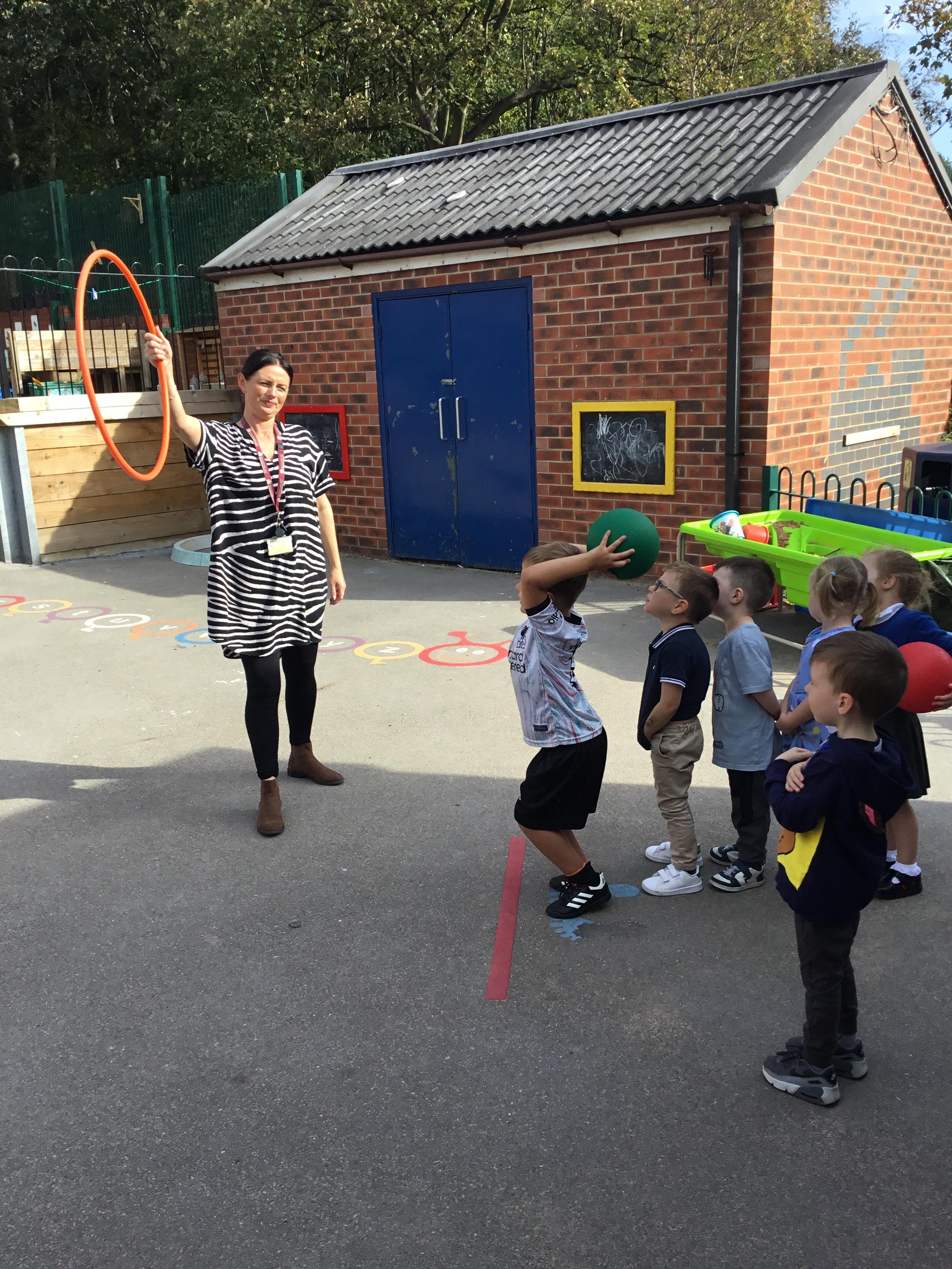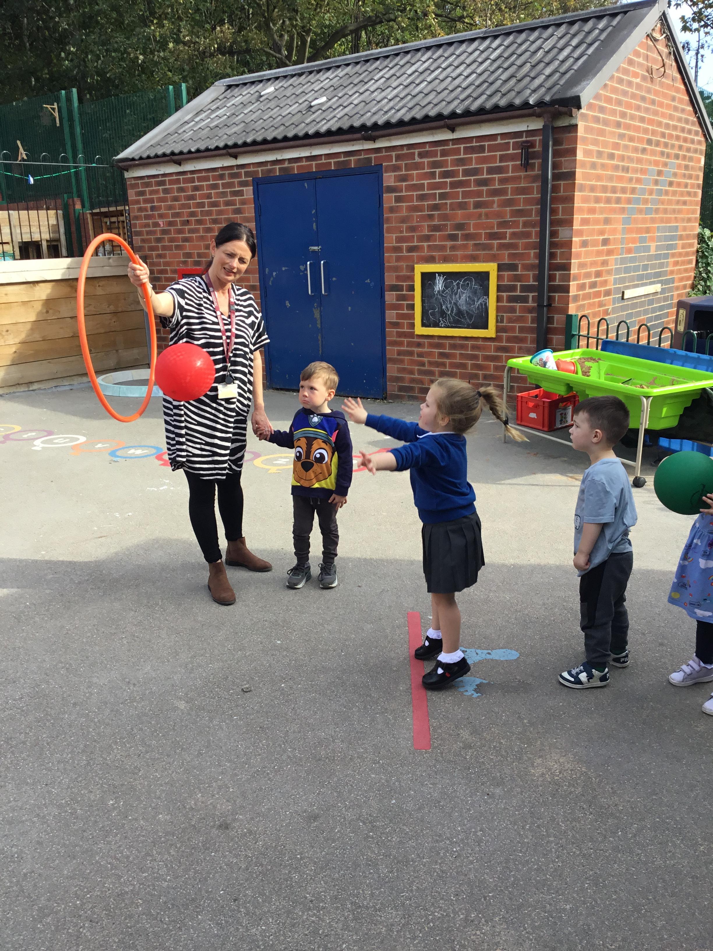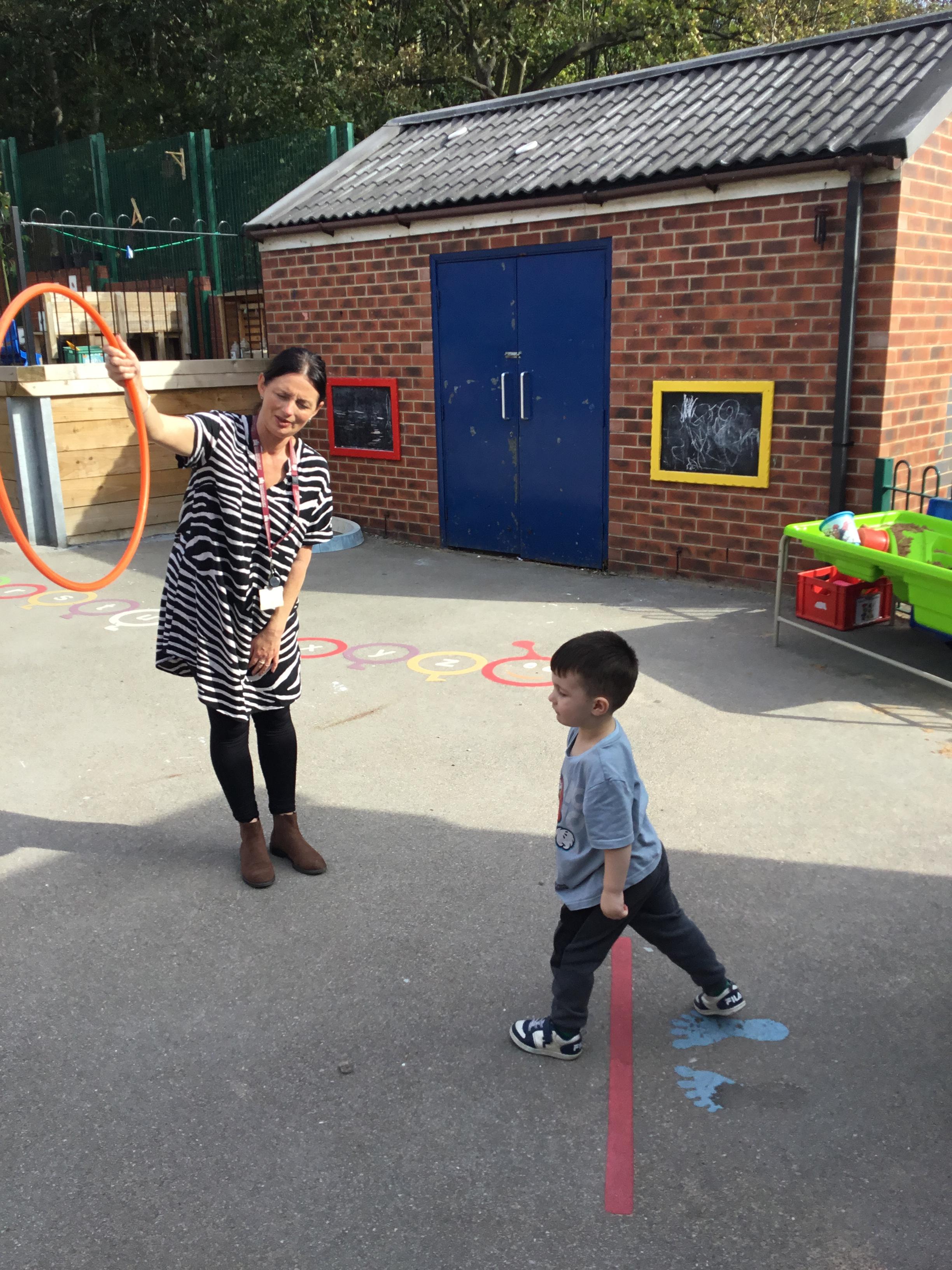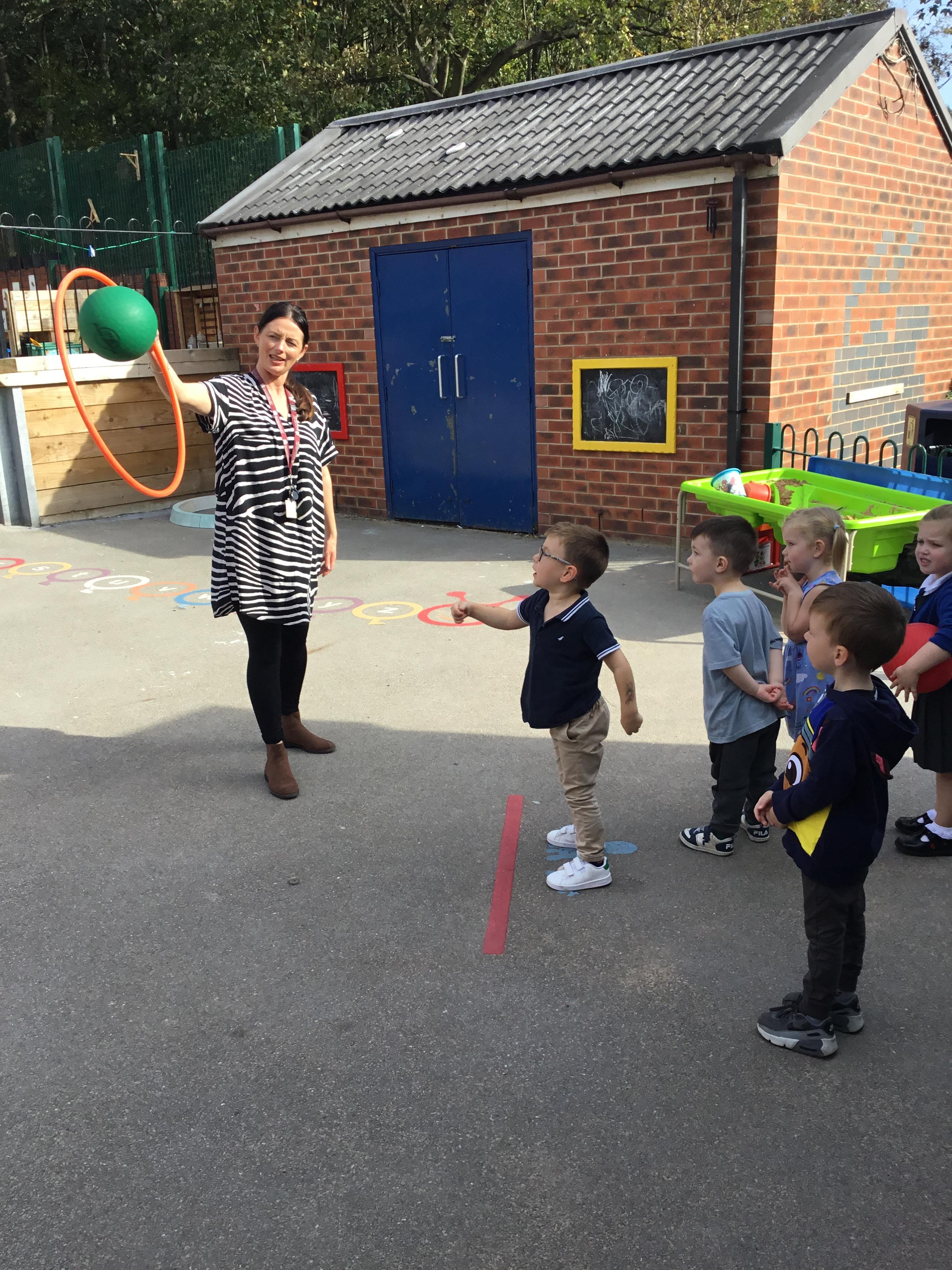 While the weather has been so good, we have been using our outdoor area to explore and learn. The children and Mrs Sykes made a game of throwing the ball through a hoop, but they had to choose if they wanted the hoop high, in the middle or low. This introduced new vocabulary and developed gross motor skills, hand eye co-ordination and was also a lot of fun!