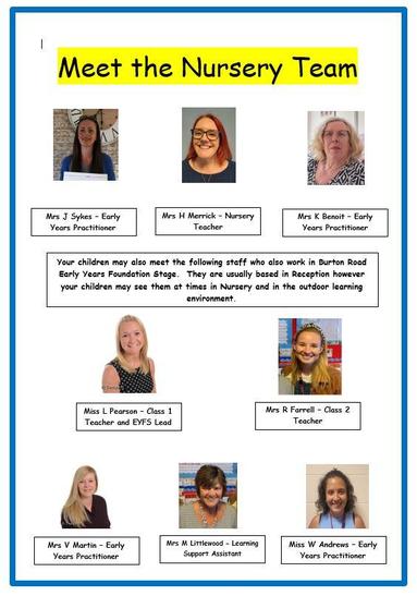 Burton Road EYFS consists of a Nursery class (AM, PM and 30 Hour Places) and two Foundation 2 Reception classes.  Please meet the team: