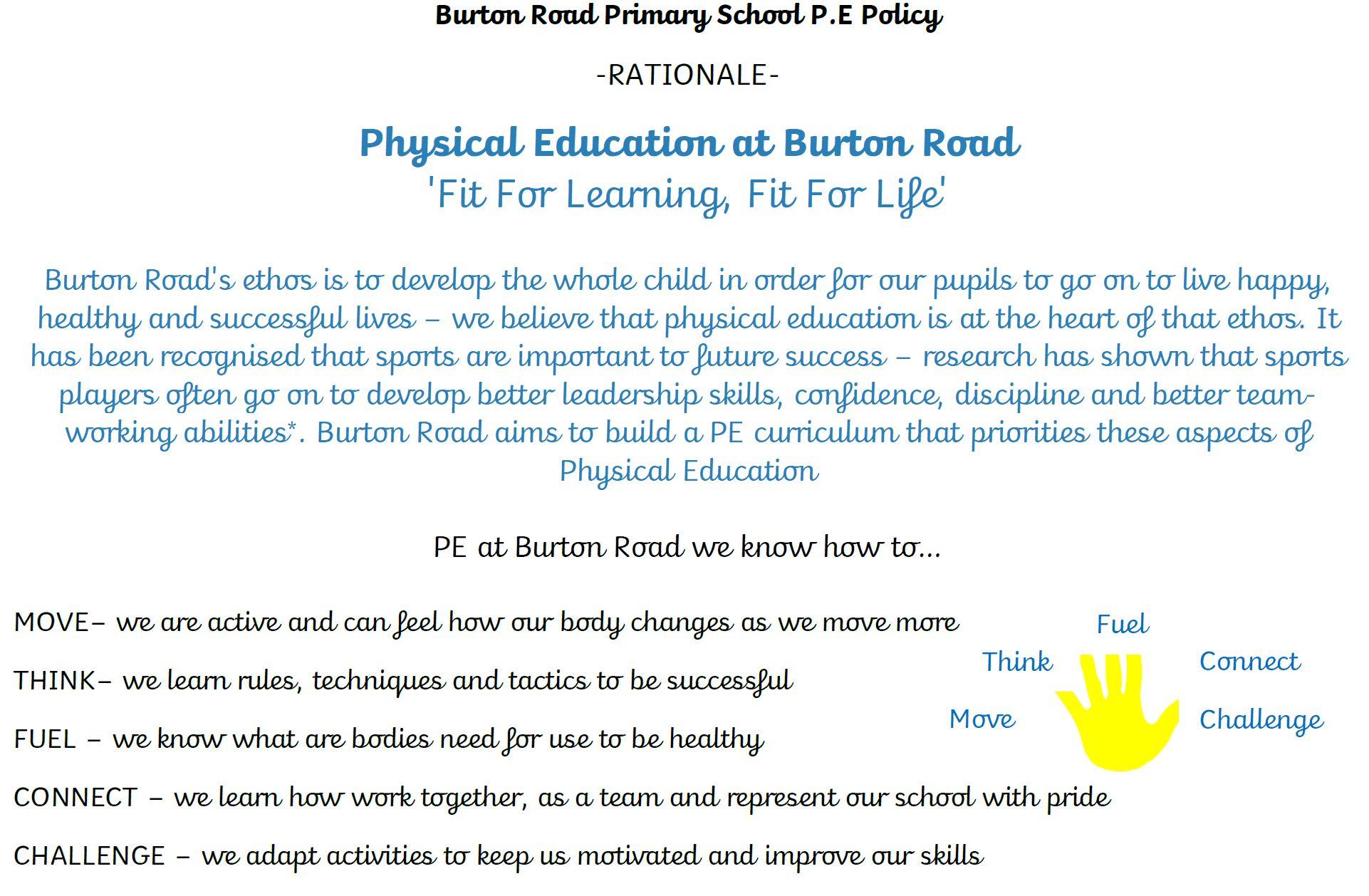 The PE Curriculum at Burton Road is designed to ensure activity, progression and engagement for all pupils, regardless of background, need or previous knowledge, and it should enable them to progress and achieve success. Our key aims are: