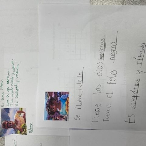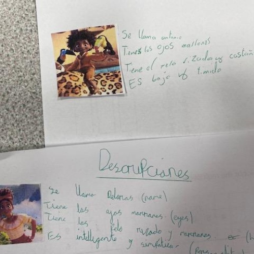 Descriptions of Encanto characters in the Spanish club. We watched the film, and we learnt how to describe eyes, hair and personality.