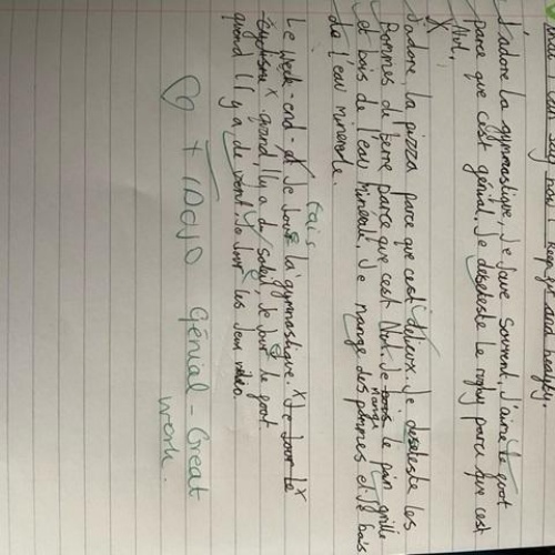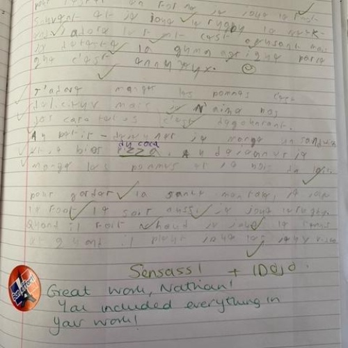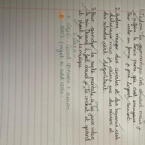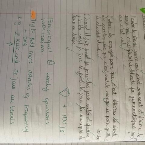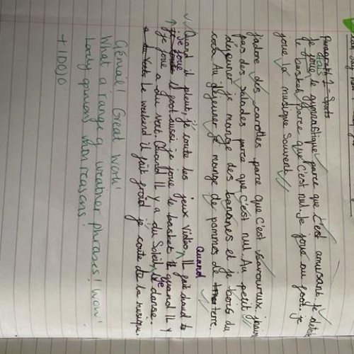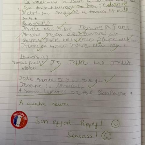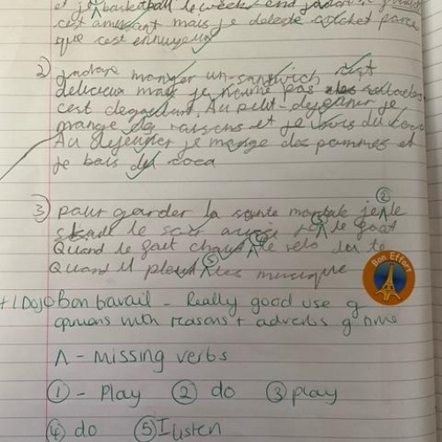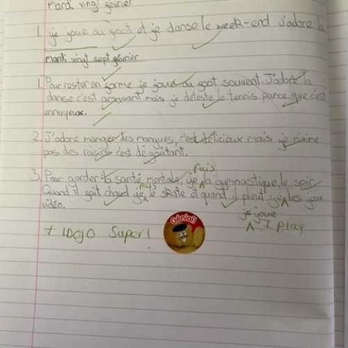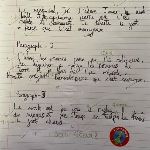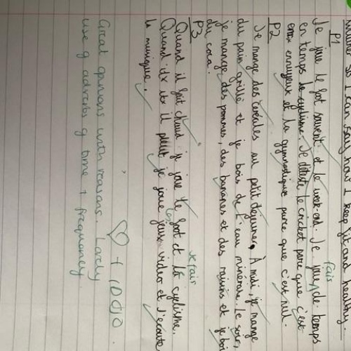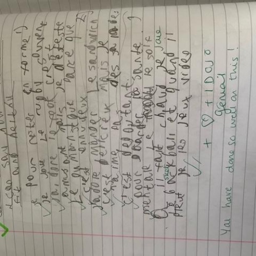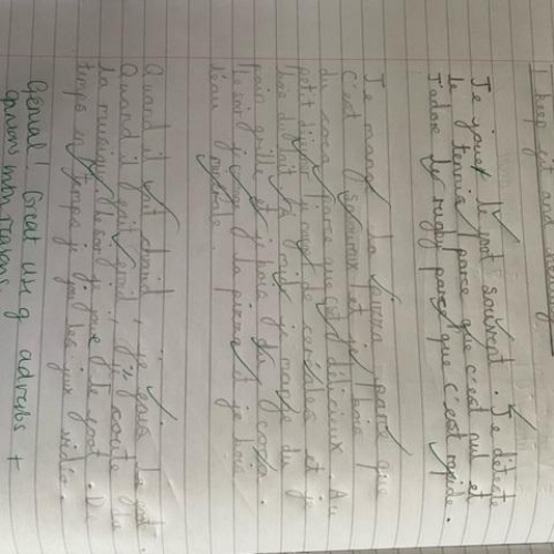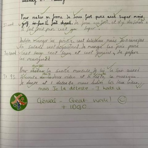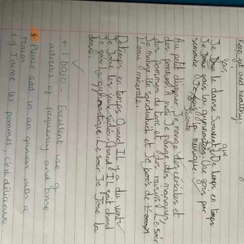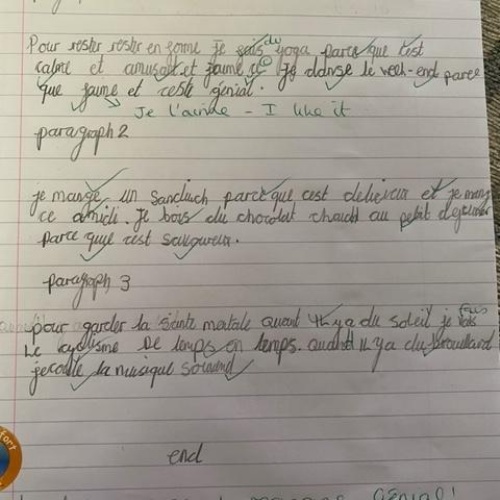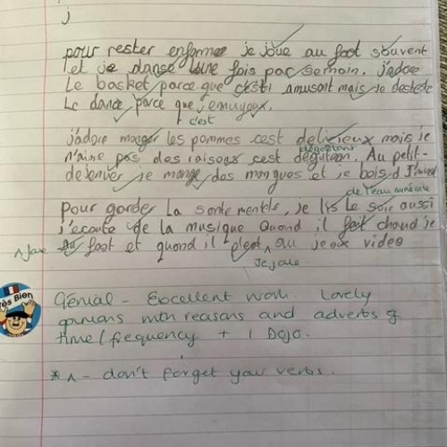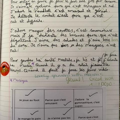 Look at some of our fabulous writing in Year 6- French work on Healthy Living. We have put together what we have been learning- sports, food/ drink/ hobbies/ adverbs of time and frequency, opinions with reasons, use of quand as a complex structure and verbs. Well done Year 6!