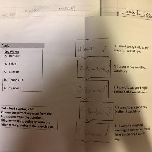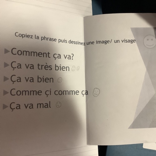 Writing – Students should be able to write the words for some greetings, feelings and write their own name. They can write some French places/ towns/ cities on a map of France. They should also be able to write some numbers up to 10 and some colours in French.